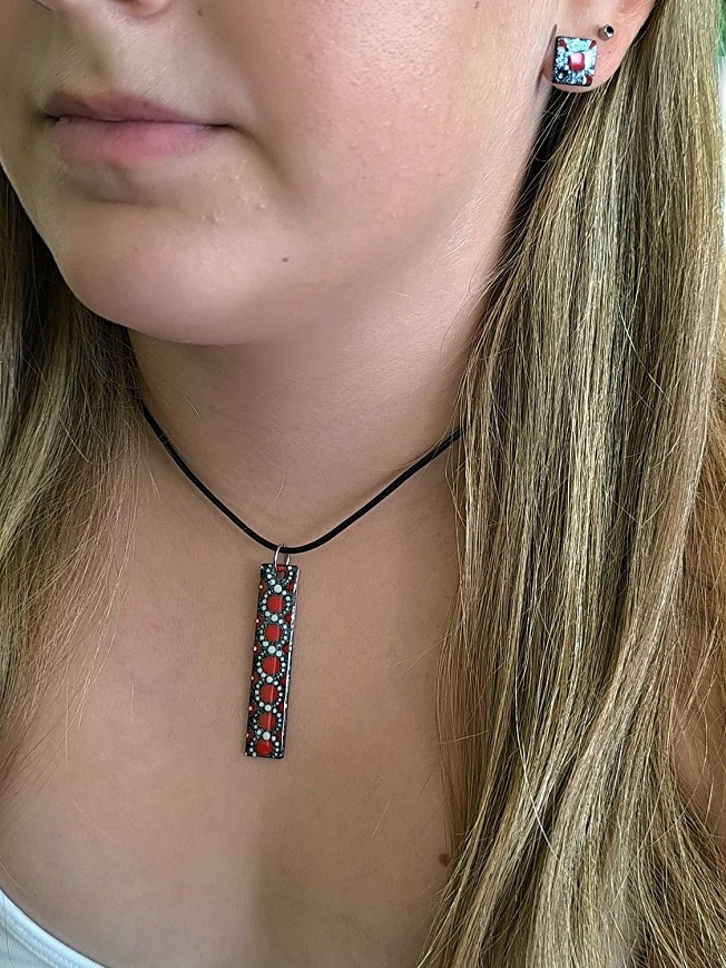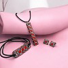 Unique hand-painted stainless steel necklace, earrings, and bracelet set, with hypoallergenic stainless steel findings, on a 45 cm waxed cord necklace.