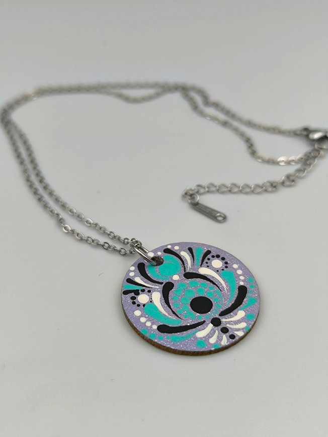 Egyedi kézzel festett fa nyaklánc, antiallergén nemesacél szerelékkel, 45 cm-es nemesacél zsinór nyakláncon, lánchosszabbítóval.