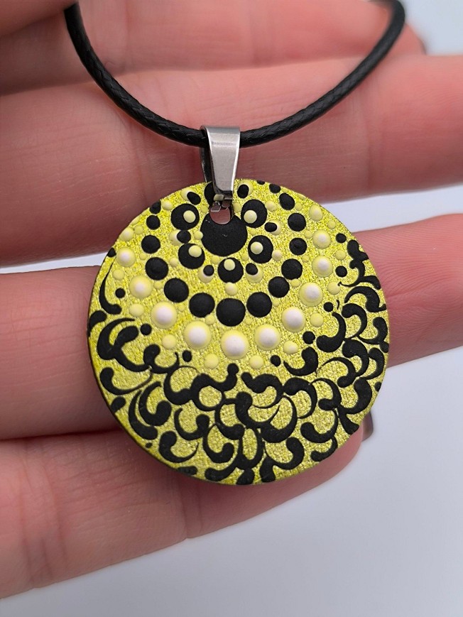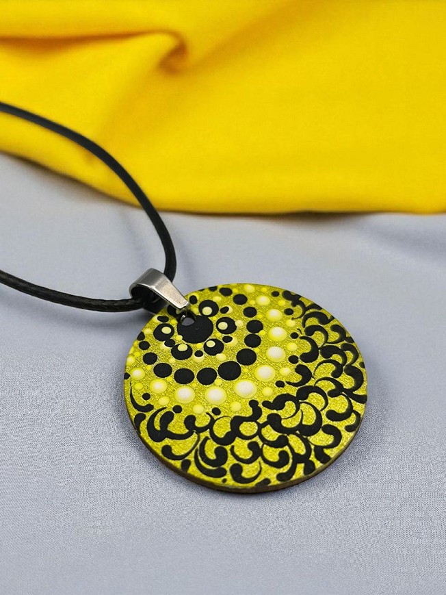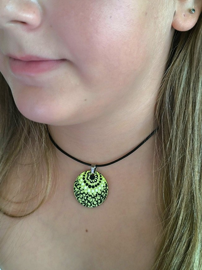 Egyedi kézzel festett fa nyaklánc, antiallergén nemesacél szerelékkel, 45 cm-es viaszolt zsinór nyakláncon, lánchosszabbítóval.