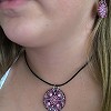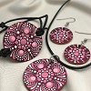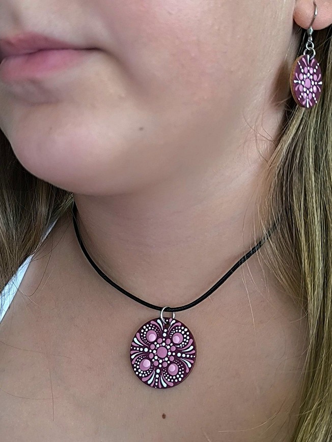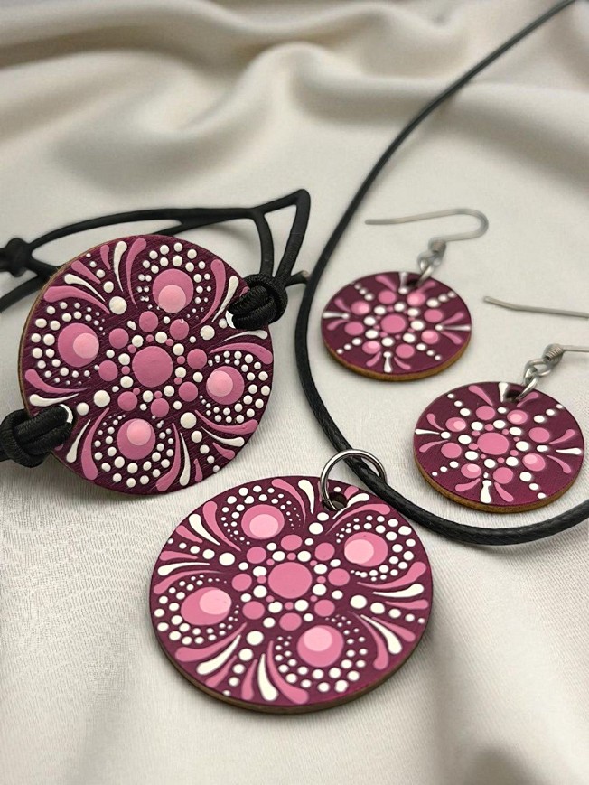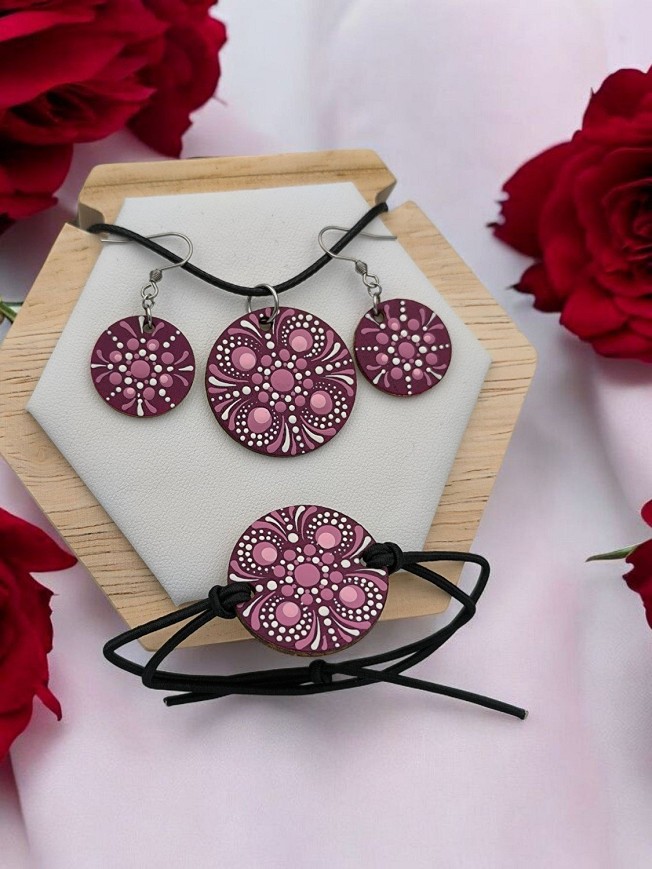 Egyedi kézzel festett fa nyaklánc, fülbevaló és karkötő szett, antiallergén nemesacél szerelékkel, 45 cm-es viaszolt zsinór nyakláncon.