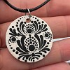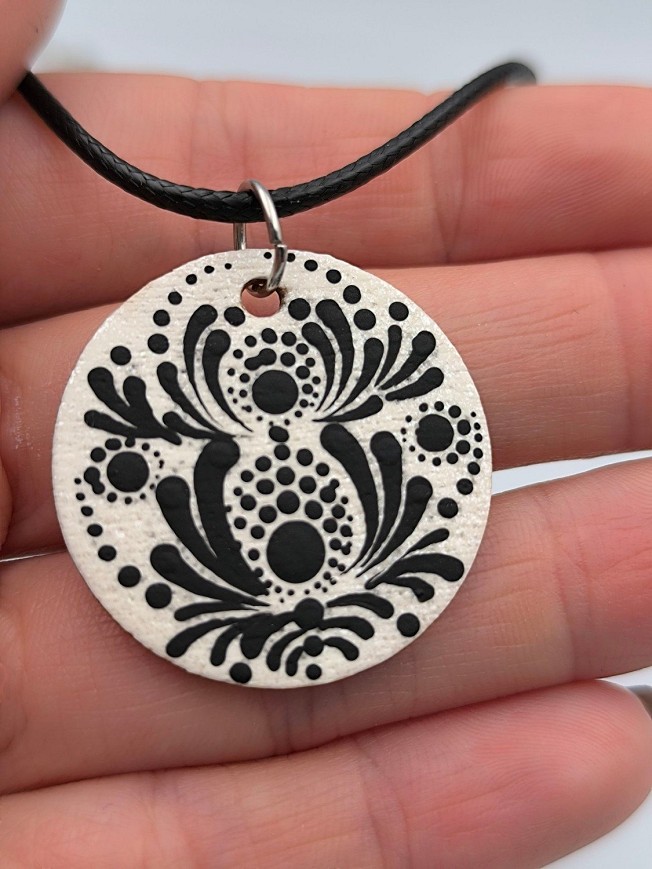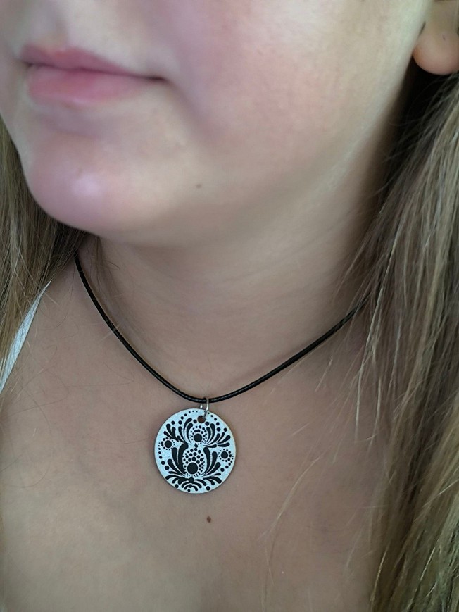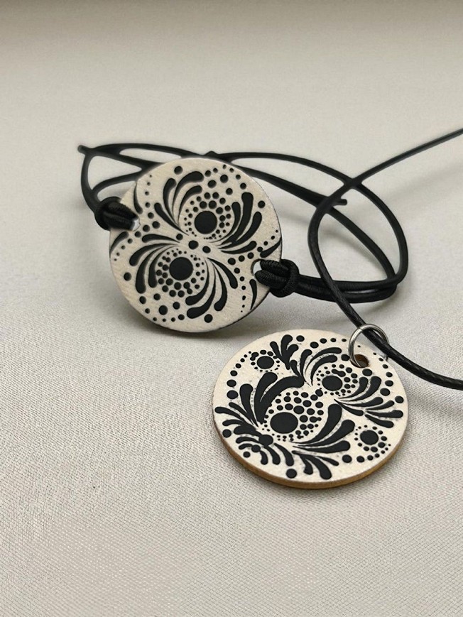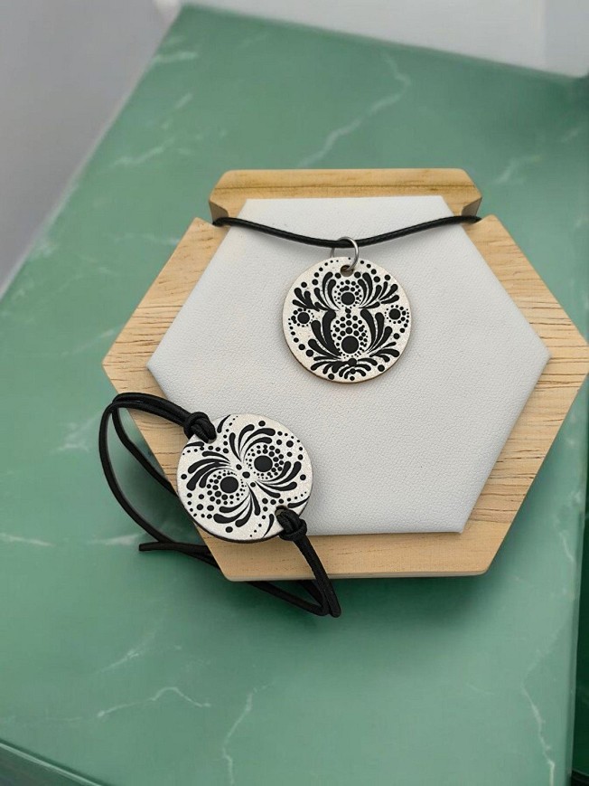 Egyedi kézzel festett fa nyaklánc és karkötő szett, antiallergén nemesacél szerelékkel, 45 cm-es viaszolt zsinór nyakláncon.