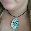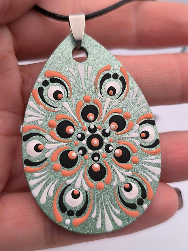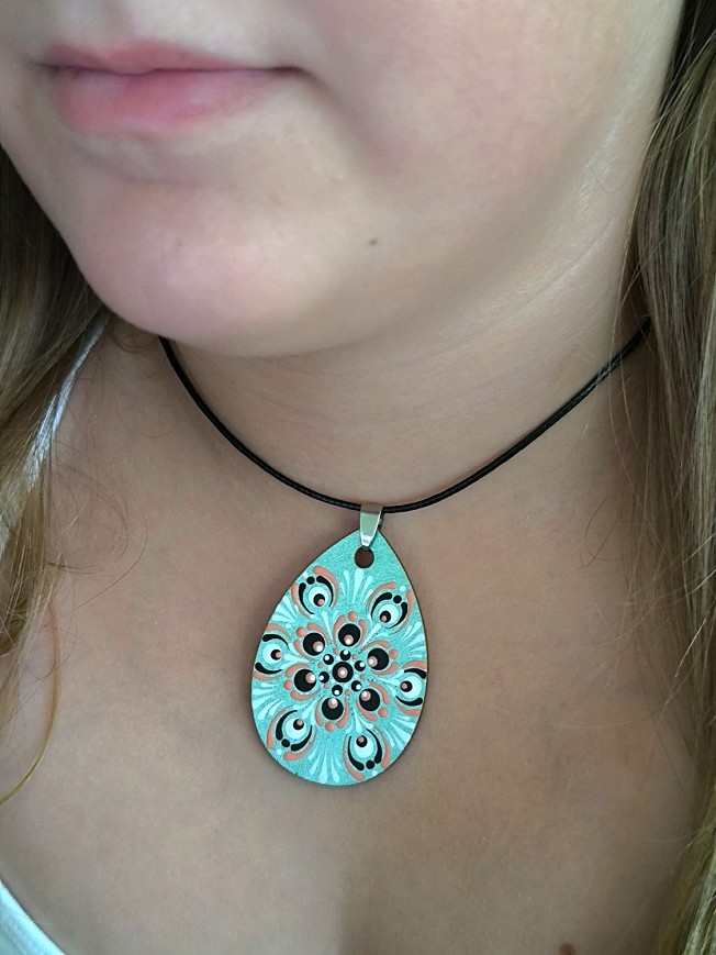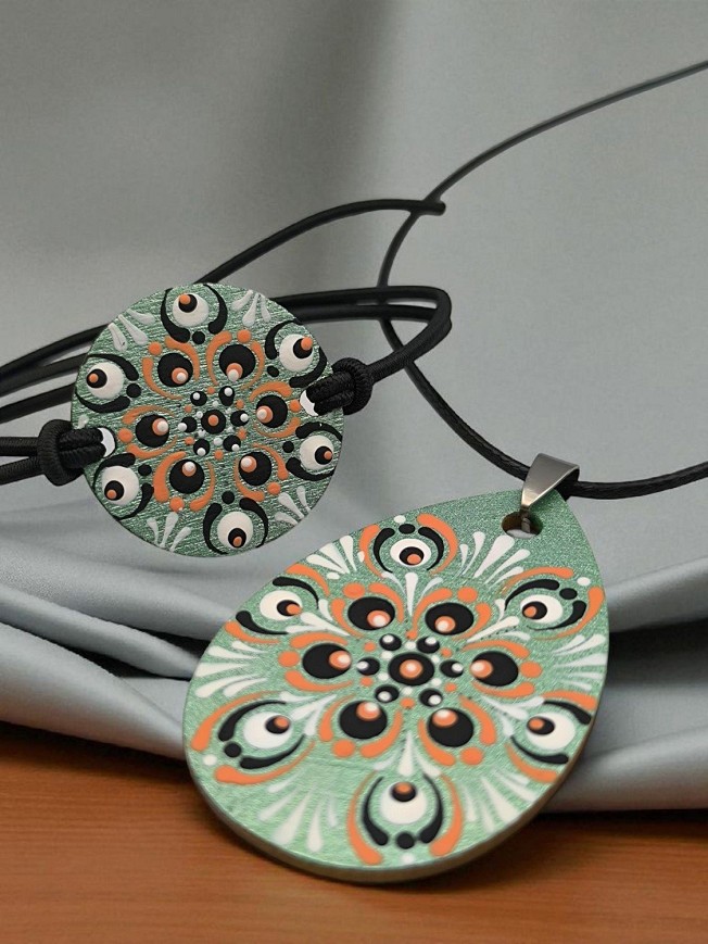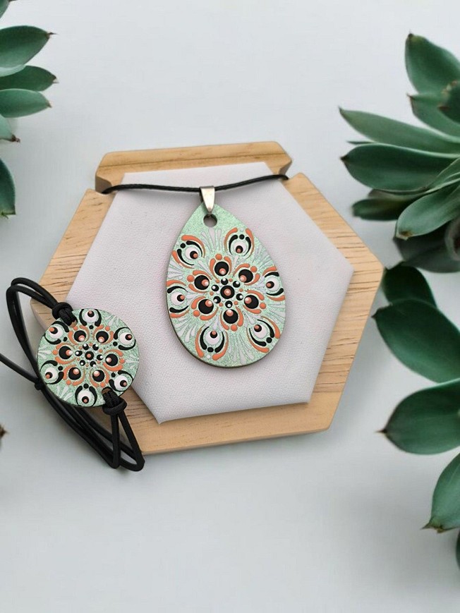 Egyedi kézzel festett fa nyaklánc és karkötő szett, antiallergén nemesacél szerelékkel, 45 cm-es viaszolt zsinór nyakláncon.