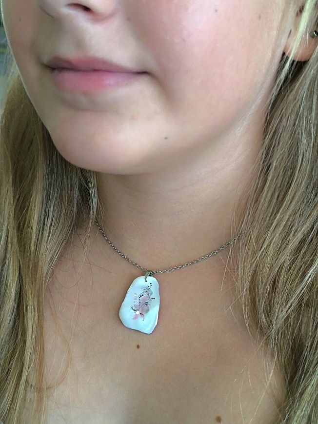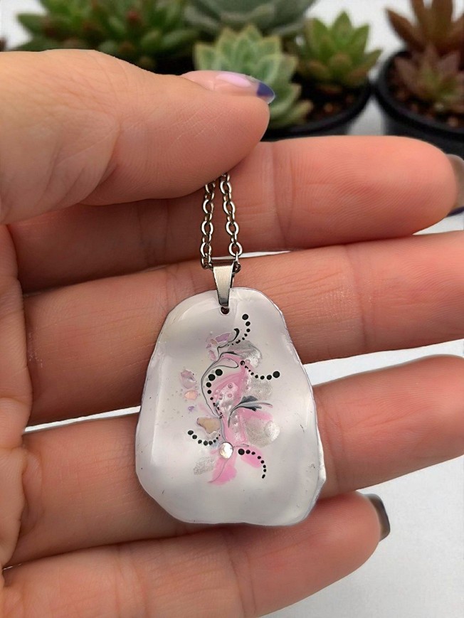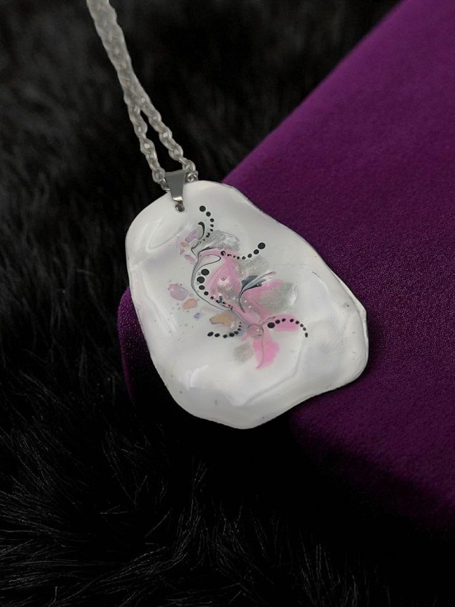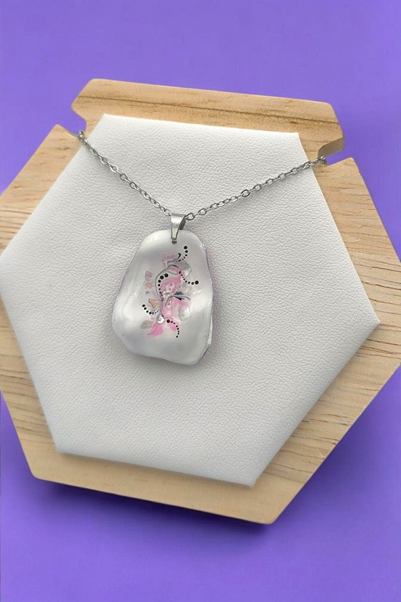 Egyedi kézzel festett gyanta nyaklánc, antiallergén nemesacél szerelékkel, 45 cm-es nemesacél láncon, lánchosszabbítóval.