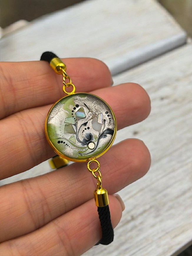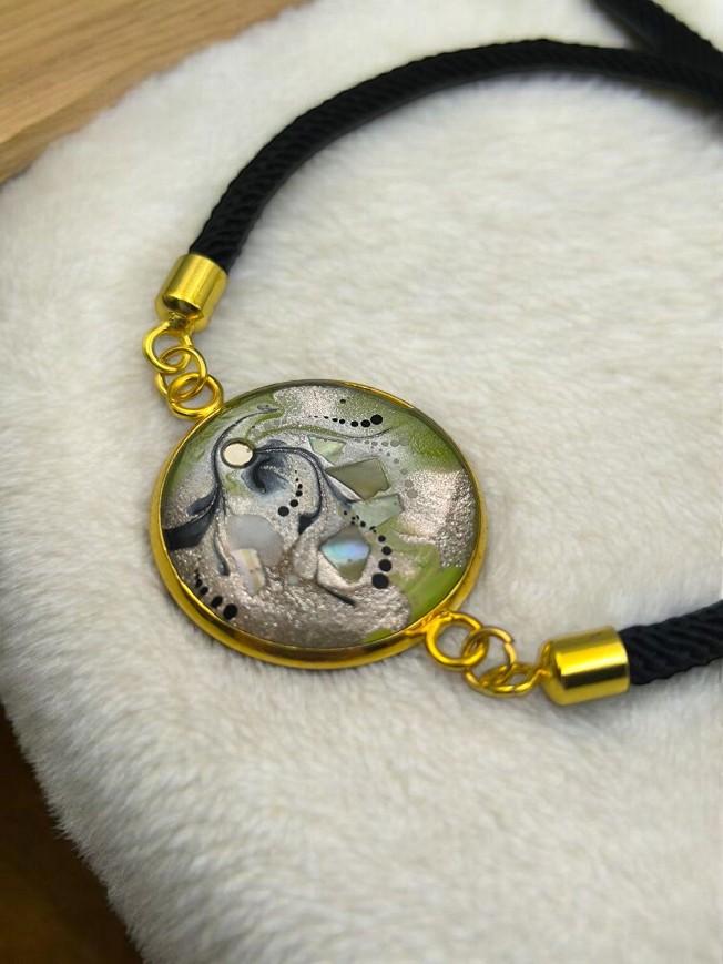 Egyedi kézzel festett nemesacél karkötő, antiallergén nemesacél szerelékkel, viaszolt zsinóron.
