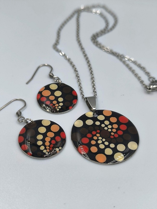 Egyedi kézzel festett nemesacél nyaklánc és fülbevaló szett, antiallergén nemesacél szerelékkel, 45 cm-es nemesacél nyakláncon.