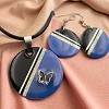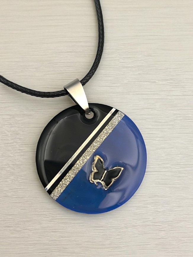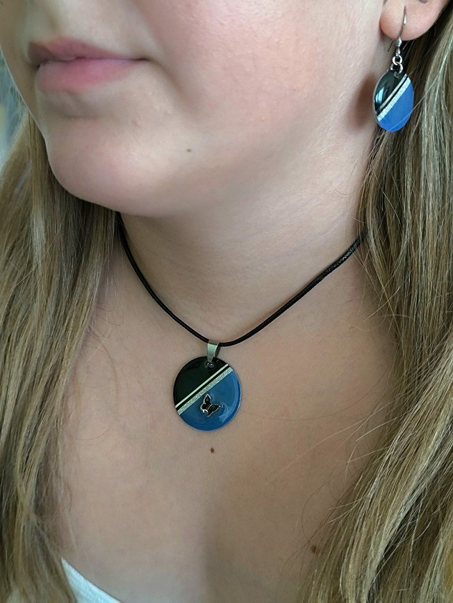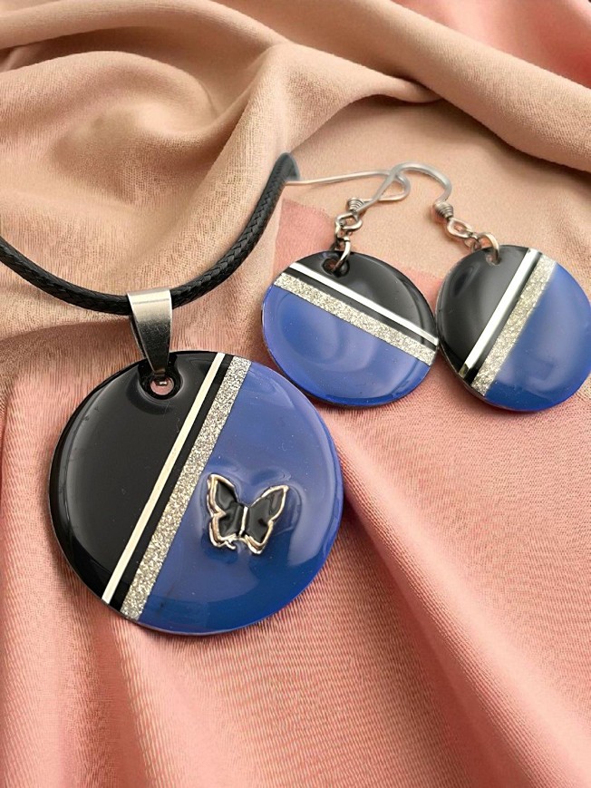 Egyedi kézzel festett nemesacél nyaklánc, fülbevaló és karkötő szett, antiallergén nemesacél szerelékkel, 45 cm-es viaszolt zsinór nyakláncon, apró 3D-s fekete pillangó díszítéssel.