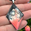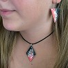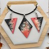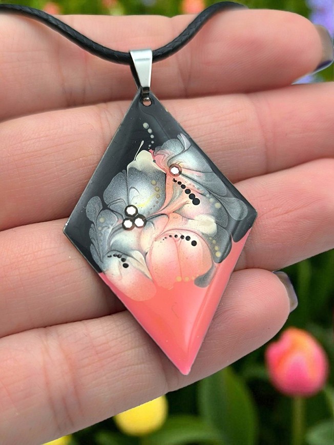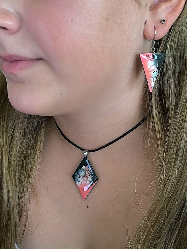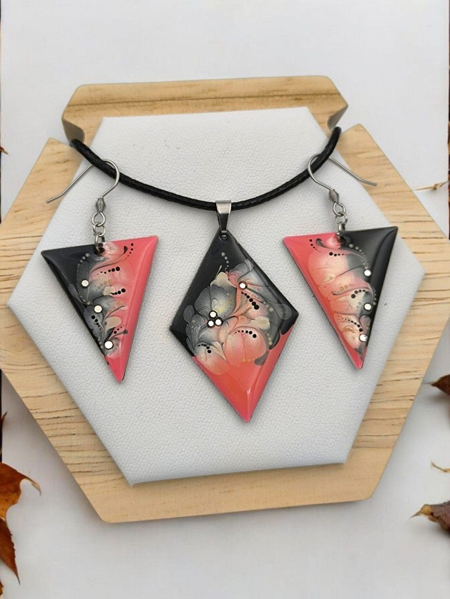 Egyedi kézzel festett nemesacél nyaklánc és fülbevaló szett, antiallergén nemesacél szerelékkel, 45 cm-es viaszolt zsinór nyakláncon.