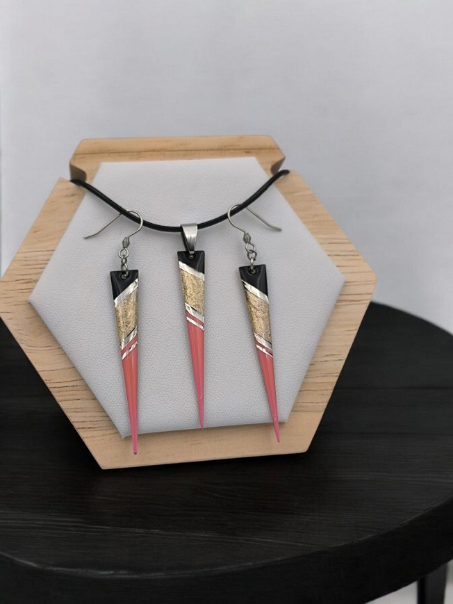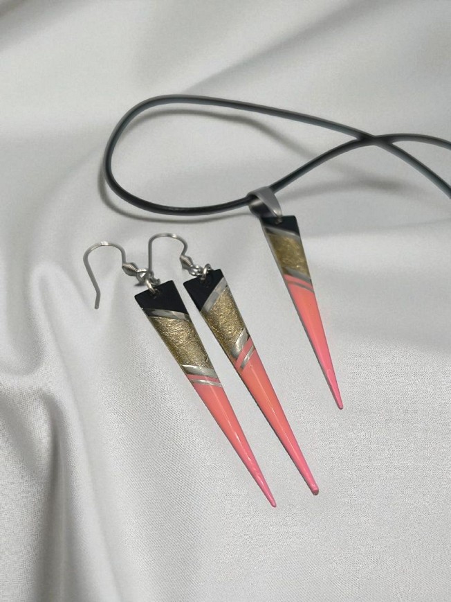 Egyedi kézzel festett nemesacél nyaklánc és fülbevaló szett, antiallergén nemesacél szerelékkel, 45 cm-es viaszolt zsinór nyakláncon.